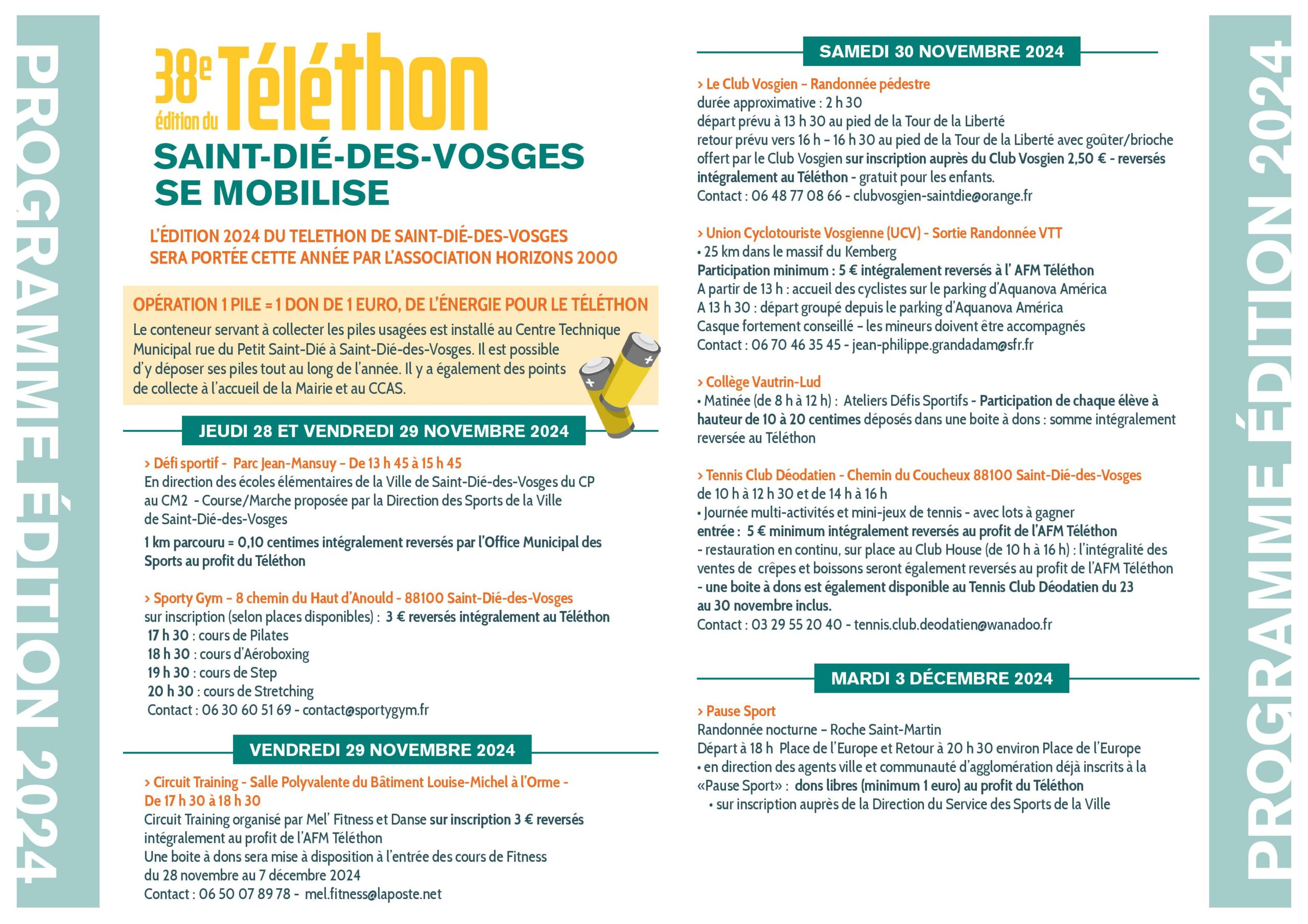 Défi sportif scolaire au parc Jean-Mansuy ces jeudi et vendredi, randonnée pédestre avec le Club Vosgien, sortie randonnée VTT avec l’UCV et journée multi-activités avec le TCD samedi, après-midi jeux à l’ancienne médiathèque Victor-Hugo mercredi prochain, initiation au tir sportif, défis billard et sortie vélo, avec la JECDE, samedi 7 décembre… Le programme complet du 38e Téléthon à Saint-Dié-des-Vosges est à retrouver ci-dessous (cliquer pour agrandir les images) :
