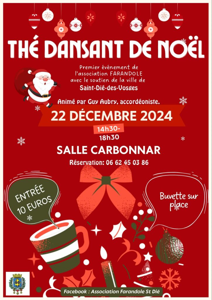 L’association Farandole organise son premier thé dansant de Noël à Saint-Dié-des-Vosges, le 22 décembre prochain de 14h30 à 18h30 à la salle Carbonnar. Le thé dansant sera animé par l’accordéoniste Guy Aubry. Le tarif d’entrée est de 10€. Buvette sur place. Réservations et renseignements complémentaires au 06-62-45-03-86.