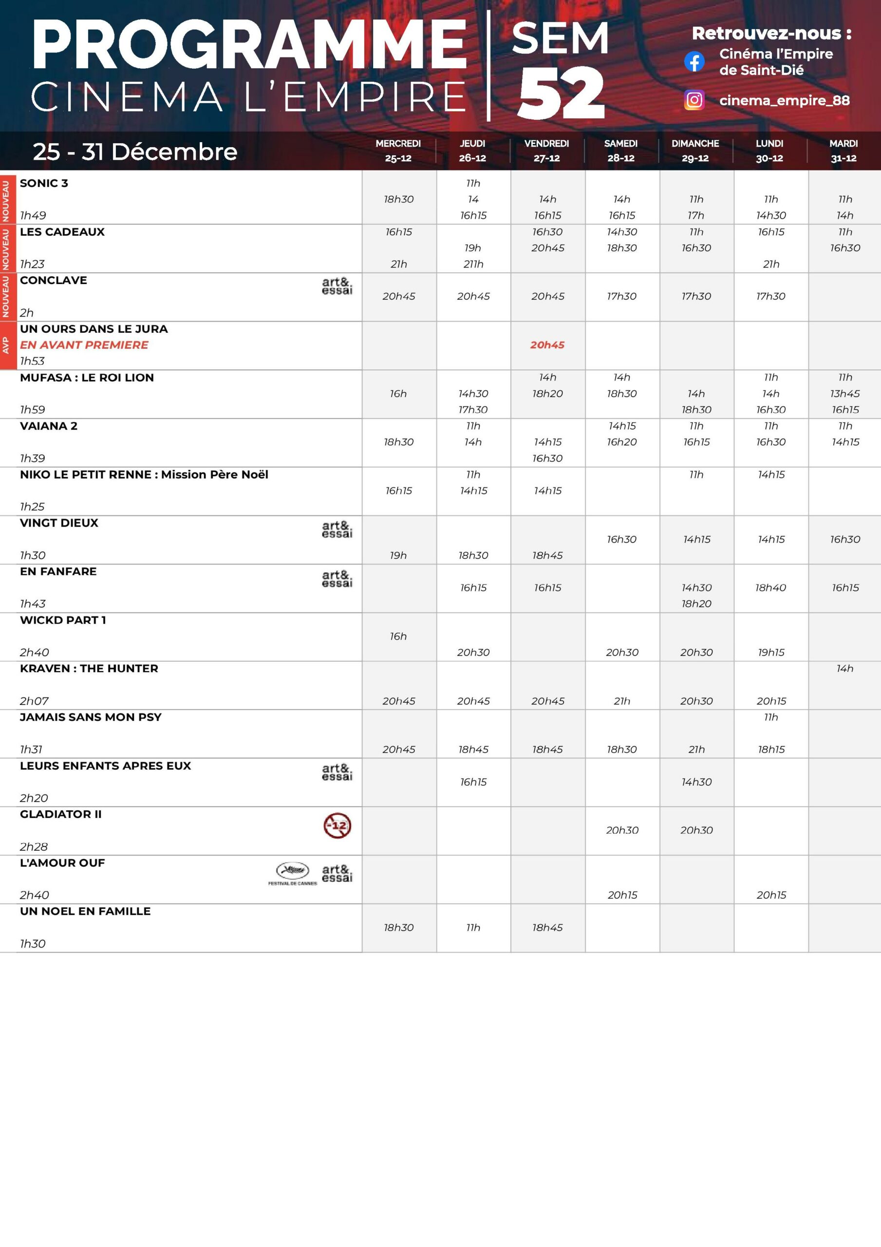 Deprecated: Use of "parent" in callables is deprecated in /project/VIDEV/web/app/plugins/simple-lightbox/includes/class.options.php on line 501 Au cinéma l'Empire du 25 au 31 décembre - Saint Die Info