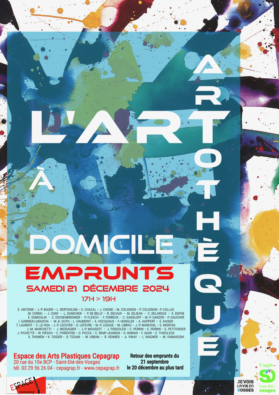 Avec l’Artothèque du CEPAGRAP, louez une œuvre d’art pour 15 euros pour le trimestre. Pour ce faire, rendez-vous ce samedi 21 décembre, de 17h à 19h, à l’Espace des Arts Plastiques déodatien, situé au 20 rue du 10e BCP. Entrée libre.