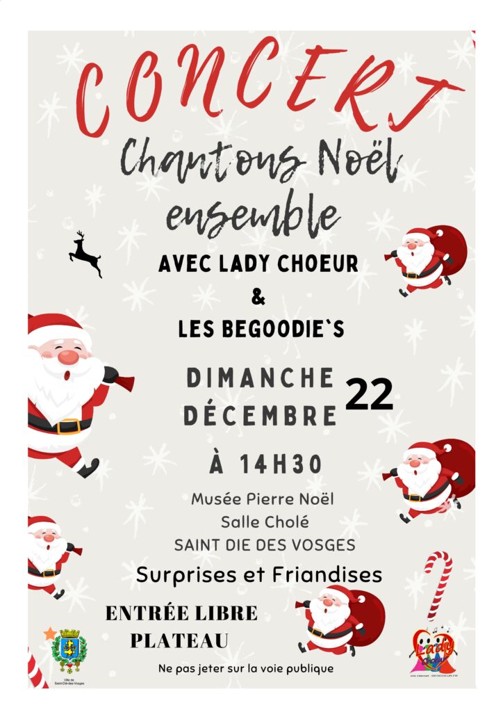 Les chorales déodatiennes Lady’Choeur et BeGoodie’s vous invitent à leur concert de Noel, qui sera donné ce dimanche 22 décembre à 14h30 à la salle François-Cholé du musée Pierre-Noël. Un moment festif et convivial gratuit et ouvert à tous, dans une salle chauffée, avec plateau à l’entrée… ainsi que des surprises et autres friandises !
