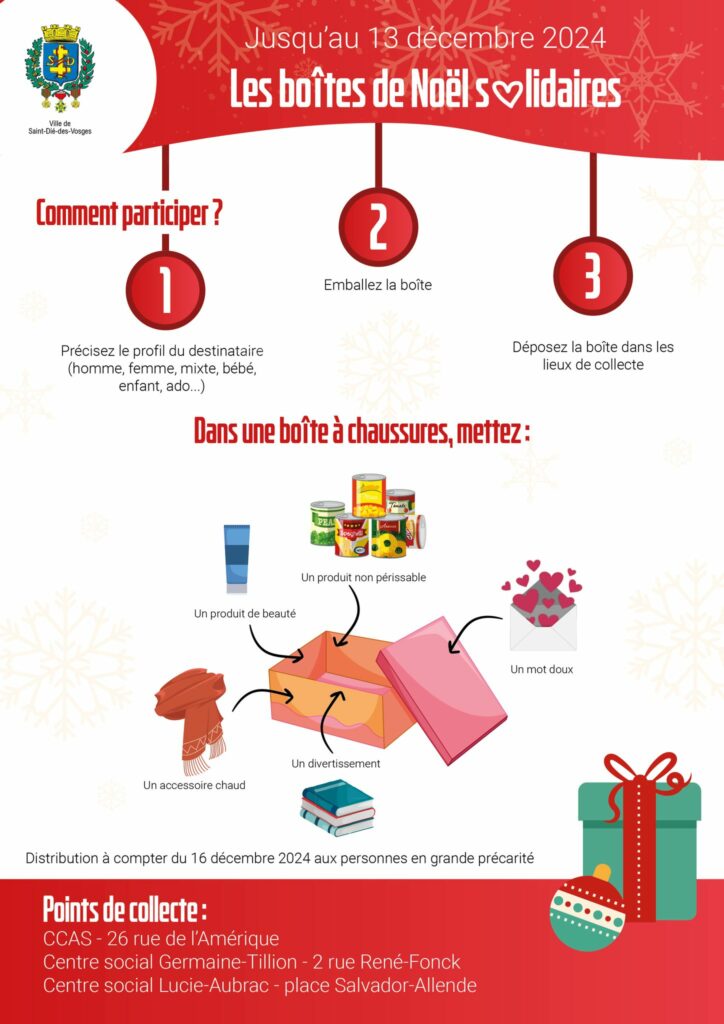 En cette fin d’année, le CCAS de Saint-Dié-des-Vosges organise l’action des « Boîtes de Noël solidaires », afin d’aider des Déodatiennes et Déodatiens en situation de précarité.