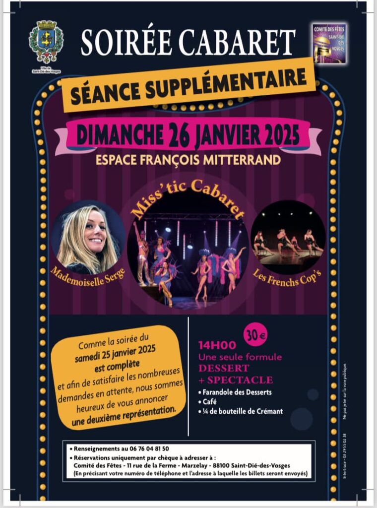 Le Comité des Fêtes de Saint-Dié-des-Vosges débutera l’année 2025 dans les starting-blocks, en organisant un week-end cabaret les 25 et 26 janvier à l’Espace François-Mitterrand. En ce 11 décembre, il reste encore quelques places pour la séance du dimanche.