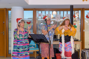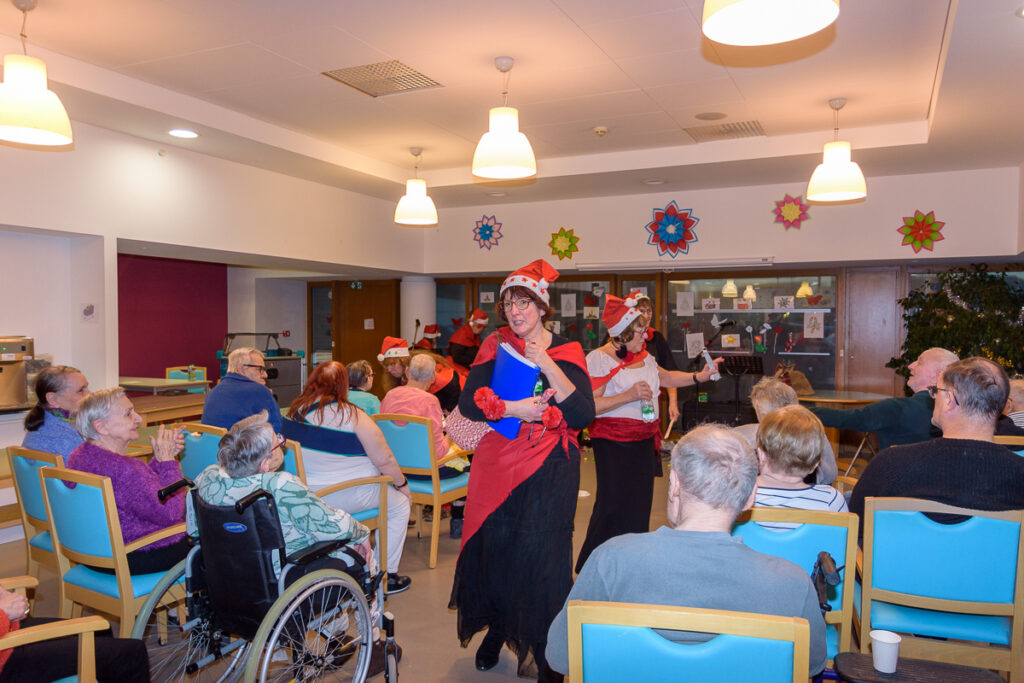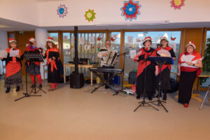 Les Gueniches, groupe de bénévoles de la section VMEH Déodatienne (Visite de Malades en Etablissement Hospitalier et en Ehpad), sillonnent les maisons de retraite pour offrir une parenthèse musicale aux résidents. Ce jeudi 26 décembre, ce fut au tour de l’EHPAD Les Charmes de recevoir leur visite pour une après-midi en musique et en chanson. Claude Thomas, l’incontournable accordéoniste, accompagnait en musique le répertoire des Gueniches. Parmi les chants les résidents ont pu entendre et entonner « Mon amant de Saint-Jean », « Aux Champs Elysées » ou encore « La Ballade des gens heureux » ainsi que des chants de Noël. Cet après-midi festif s’est conclu par la distribution de brioches offertes par la section locale VMEH.