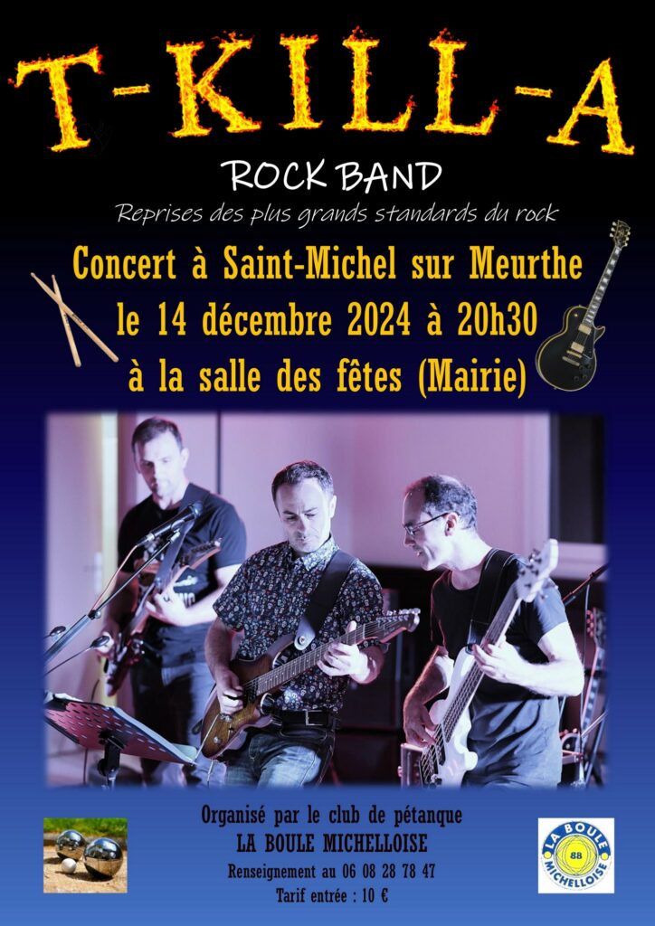 Lors de ce concert, le groupe T-Kill-A revisitera une trentaine des plus grands standards du rock. De 1950 à nos jours, pour environ 2h30 de spectacle en live. Le tarif d’entrée est de 10€ par personne. Plus de renseignements auprès de la présidente de la Boule Michelloise Danièle Caratti, par téléphone au 06-08-28-78-47.