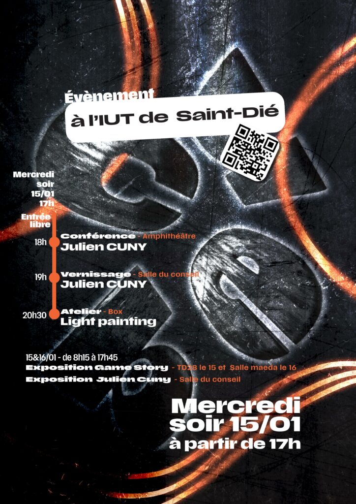 Demain soir à partir de 18h, une soirée gratuite et ouverte à tous est organisée, toujours autour de la thématique de la 3D. Julien Cuny animera une conférence, durant laquelle il partagera son approche et son expertise dans l’univers de la 3D. S’enchaînera le vernissage de son exposition puis un atelier de light painting. Sans oublier le food-truck garé devant l’IUT, qui permettra de se restaurer et désaltérer.