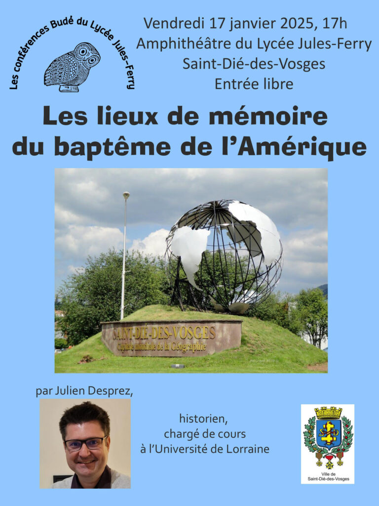 La prochaine conférence Budé se tiendra le vendredi 17 janvier, à 17h à l’amphithéâtre de la Cité Scolaire Jules-Ferry. Cette conférence, intitulée « Les lieux de mémoire du baptême de l’Amérique », sera animée par Julien Desprez, historien et chargé de cours à l’Université de Lorraine. Entrée libre. Pour toute informations complémentaire : association.bude88@gmail.com.