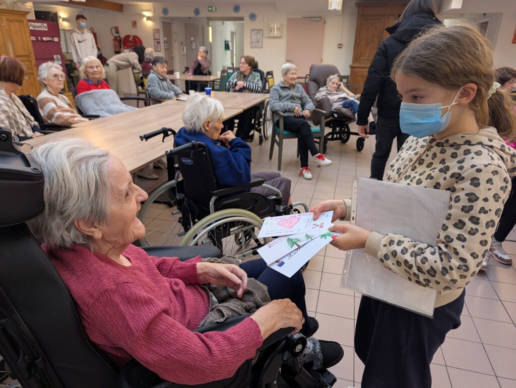Ce mercredi après-midi, c’est accompagnée des jeunes Baptiste, Gwenn, Louisa, Milane, Olympe et Zulika que Roselyne Froment s’est rendue à la Résidence de l’Âge d’Or, pour offrir quelques-unes de ces cartes de début d’année. Aux résidents, mais aussi au personnel de l’établissement. Un moment intergénérationnel apprécié des séniors comme des enfants, qui s’est enchaîné par une seconde distribution. Cette fois-ci à la Résidence du Parc, du côté de l’avenue Rovel.