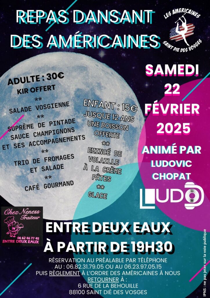 Samedi 22 février, à partir de 19h30, les majorettes Les Américaines organisent leur repas dansant à Entre-Deux-Eaux, qui sera animé par Ludovic Chopat. Tous les détails sont à retrouver sur l’affiche ci-dessous, en sachant qu’une réservation préalable est demandée, par téléphone au 06-82-31-79-05 ou 06-23-97-05-15.