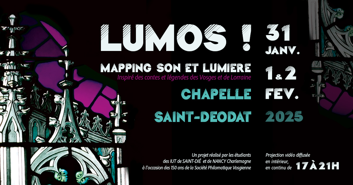 Baptisé « Lumos », ce projet est réalisé par les étudiants des IUT de Saint-Dié-des-Vosges et de Nancy Charlemagne. D’une durée de 20 minutes, le spectacle sera projeté en continu de 17h à 21h pendant les trois jours. Les visiteurs auront donc la possibilité d’entrer et sortir librement de la chapelle.