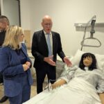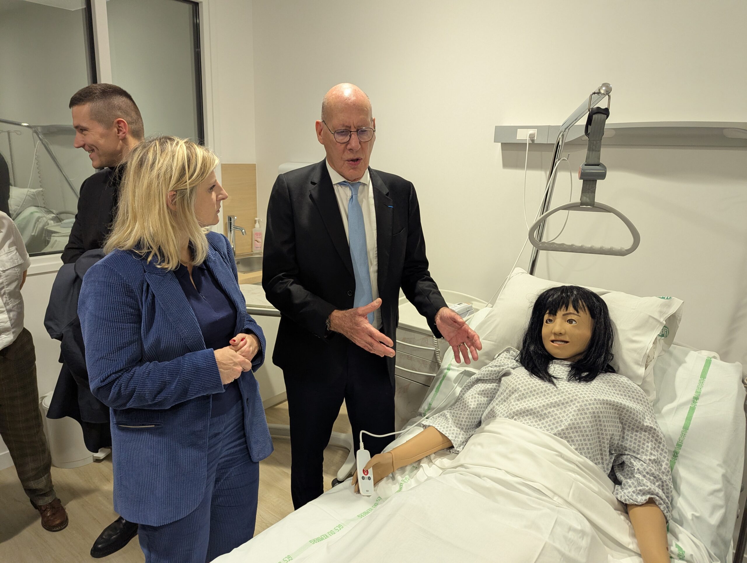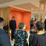 A ses côtés se trouvaient le maire Bruno Toussaint, également président du Conseil de Surveillance des HMV, la première vice-présidente du Conseil Régional Valérie Debord, le conseiller régional et ancien maire David Valence, le sous-préfet de l’arrondissement de Saint-Dié-des-Vosges Antoine Planquette, le député de la deuxième circonscription des Vosges Gaëtan Dussausaye. Après les prises de parole successives, des visites des 2 étages étaient organisées afin de présenter les différentes facettes du pôle de formations paramédicales déodatien.