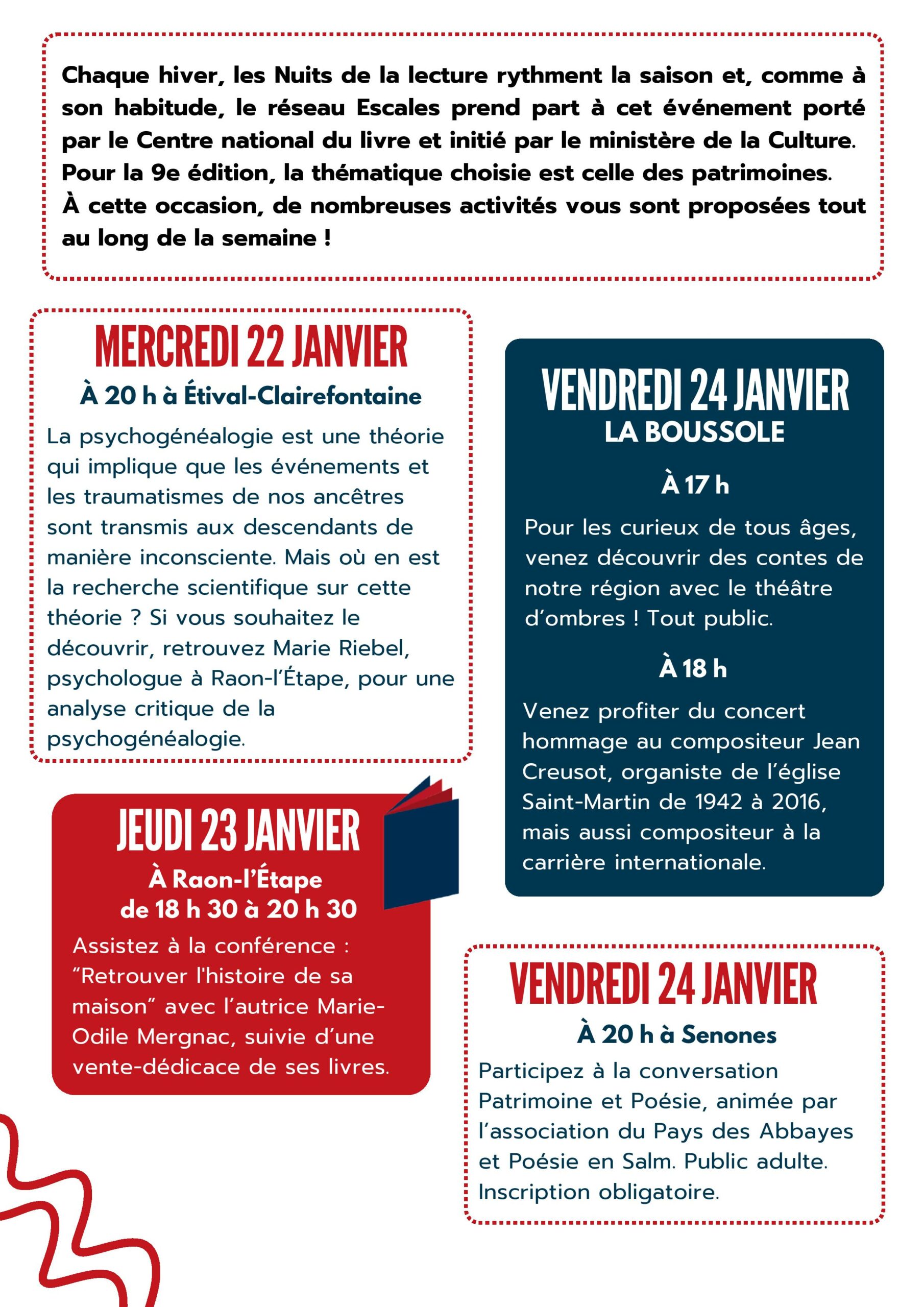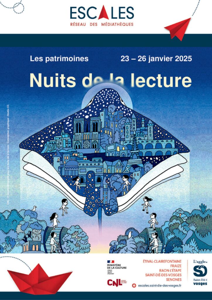 Neuvième chapitre pour les Nuits de la Lecture, qui se dérouleront du 23 au 26 janvier prochains. En France, mais aussi à l’étranger, cette édition 2025 a pour thème les patrimoines. Comme chaque année, la Déodatie, via le réseau Escales de la Communauté d’Agglomération, se fait l’écho de cette grande manifestation culturelle portée par le Ministère de la Culture et le Centre National du Livre – CNL.