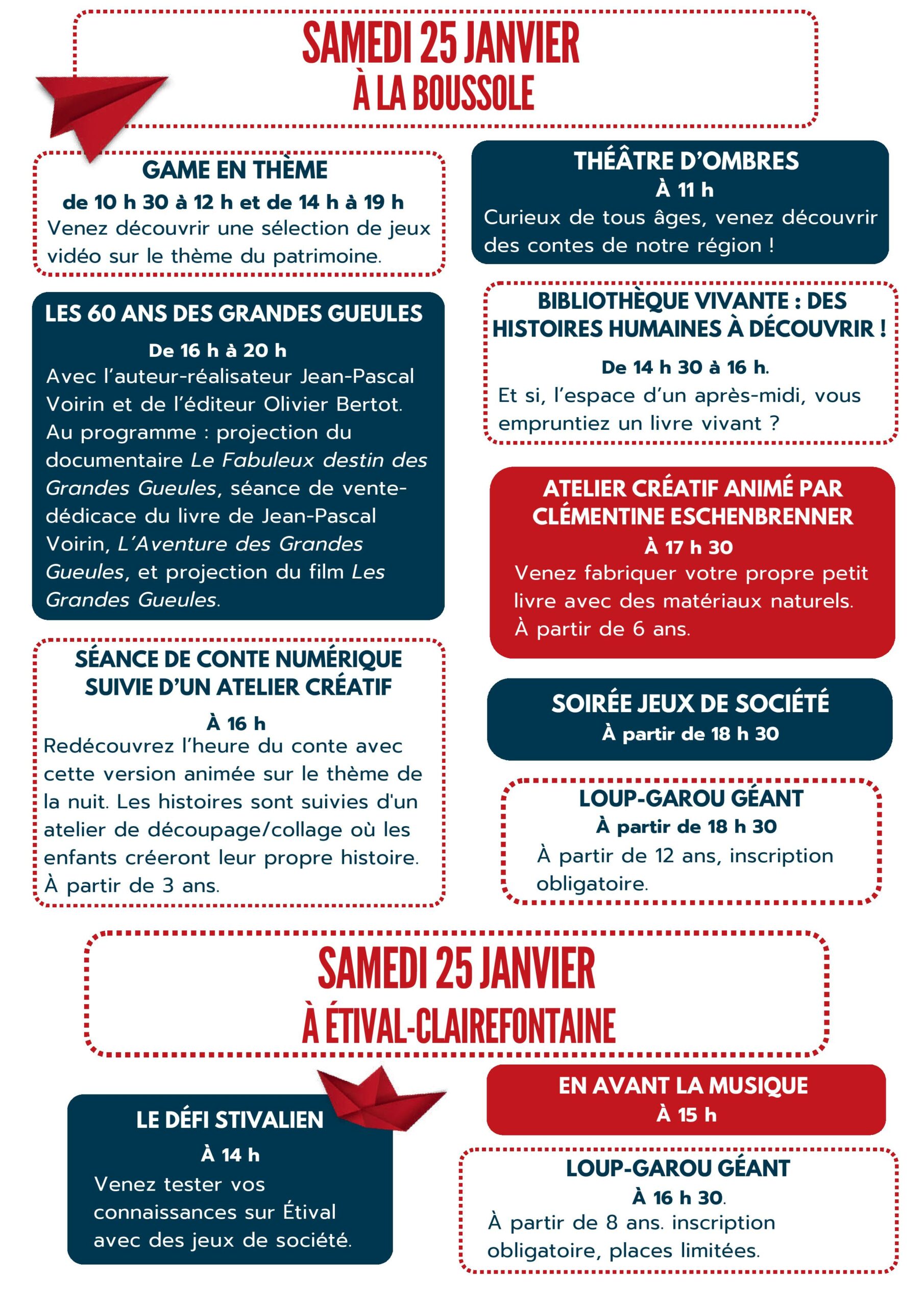 Concert hommage au compositeur Jean Creusot, bibliothèque vivante, découverte de la psychogénéalogie, conférence, conservation entre patrimoine et poésie, conte, ateliers créatifs, théâtre, musique, jeux-vidéos et jeux de société, projection du documentaire « Le fabuleux destin des Grandes Gueules », loup-garou géant… le programme complet et détaillé est à retrouver ci-dessous :
