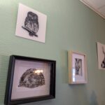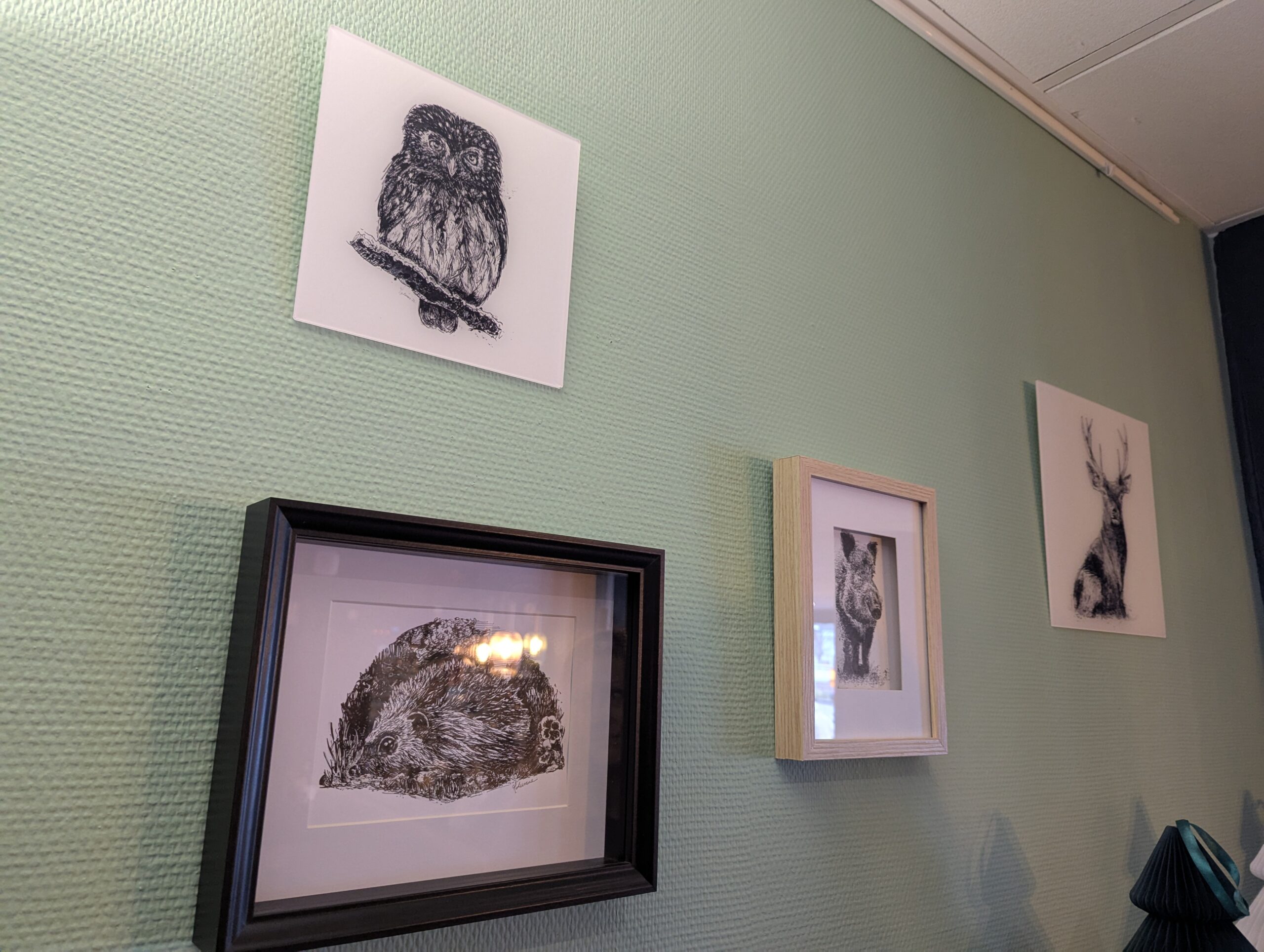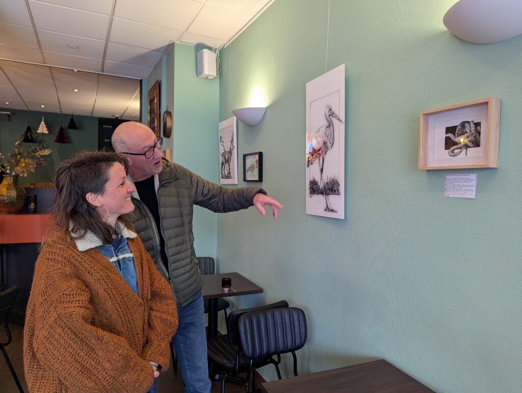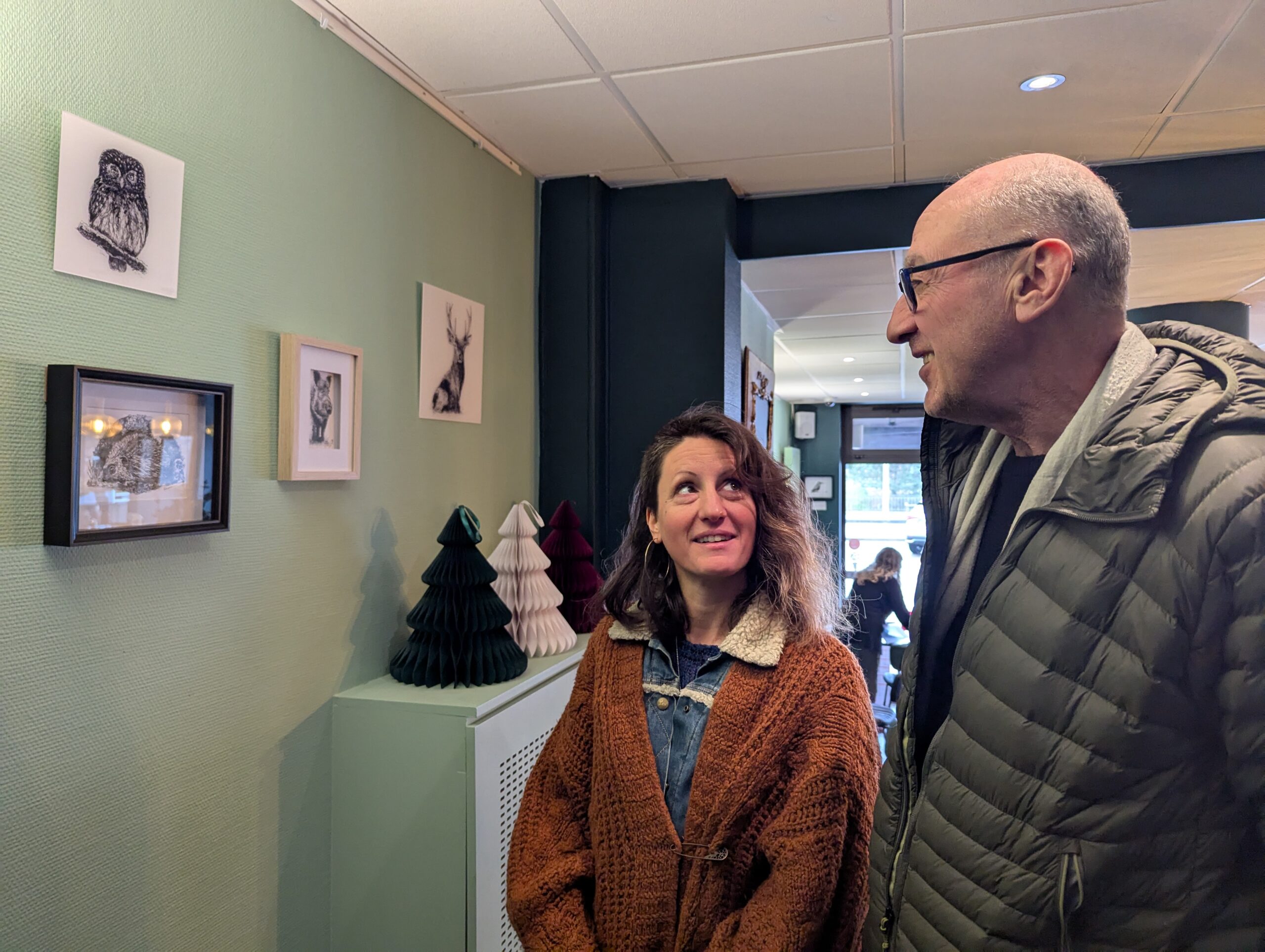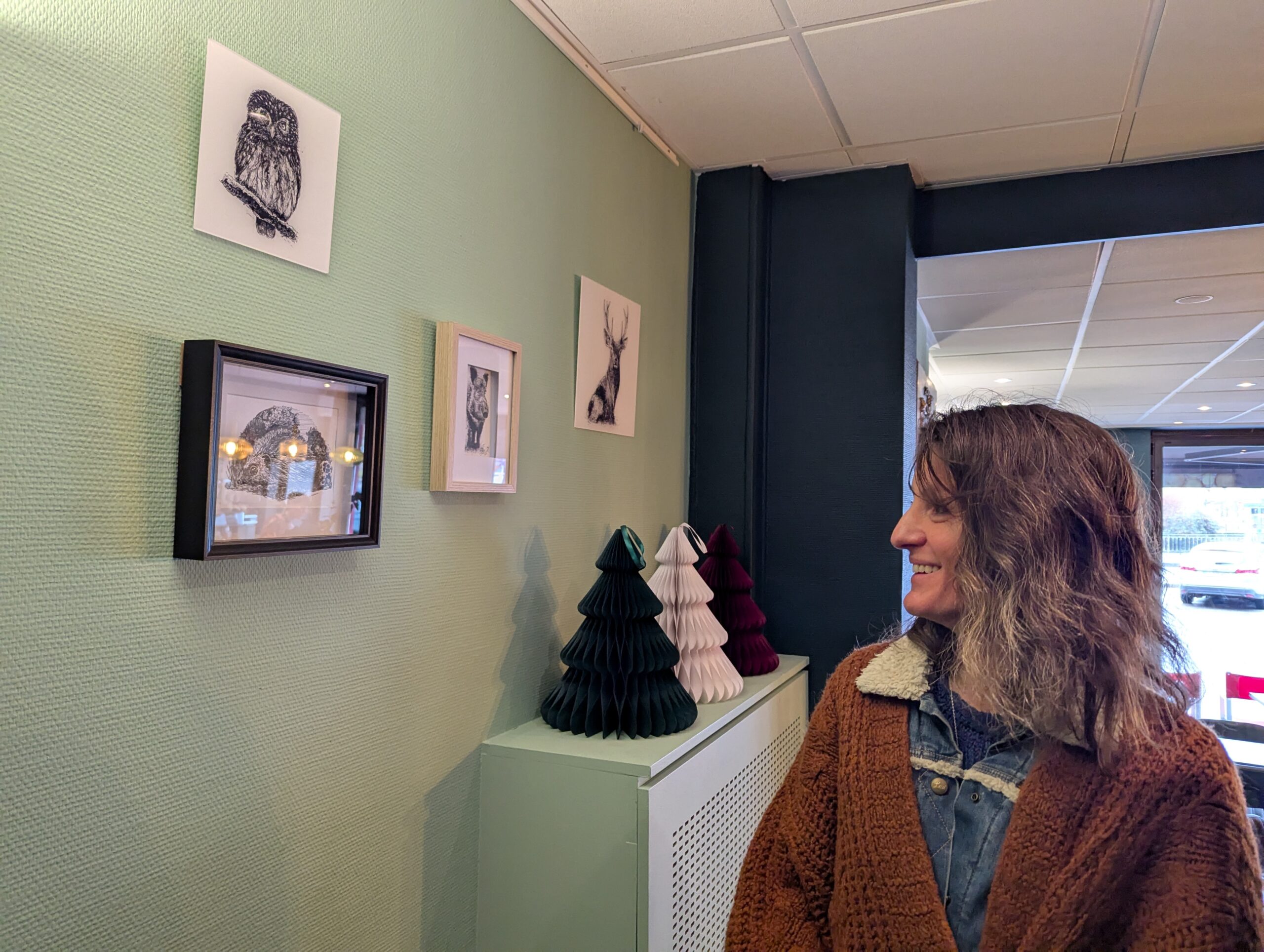 Pour son exposition au bar Les Deux Rives, l’artiste a sélectionné une quinzaine d’œuvres, de formats divers, consacrées à la faune. Au fil de l’exposition, on retrouve des animaux familiers des Vosges, comme le cerf, la chouette, le lynx ou le sanglier, de même qu’une cigogne, une pieuvre ou un panda roux.