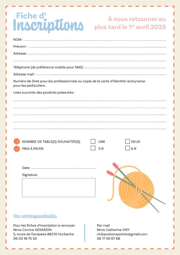 Pour s’inscrire, il suffit de remplir le bon ci-dessous et de le renvoyer, une fois dument rempli et avant le 1er avril, par courrier à Corinne Gerardin (5, route de Denipaire 88210 Hurbache) ou par courriel à Catherine Viry (via clubauxbonspoints@gmail.com). Pour tous renseignements complémentaires : clubauxbonspoints@gmail.com.