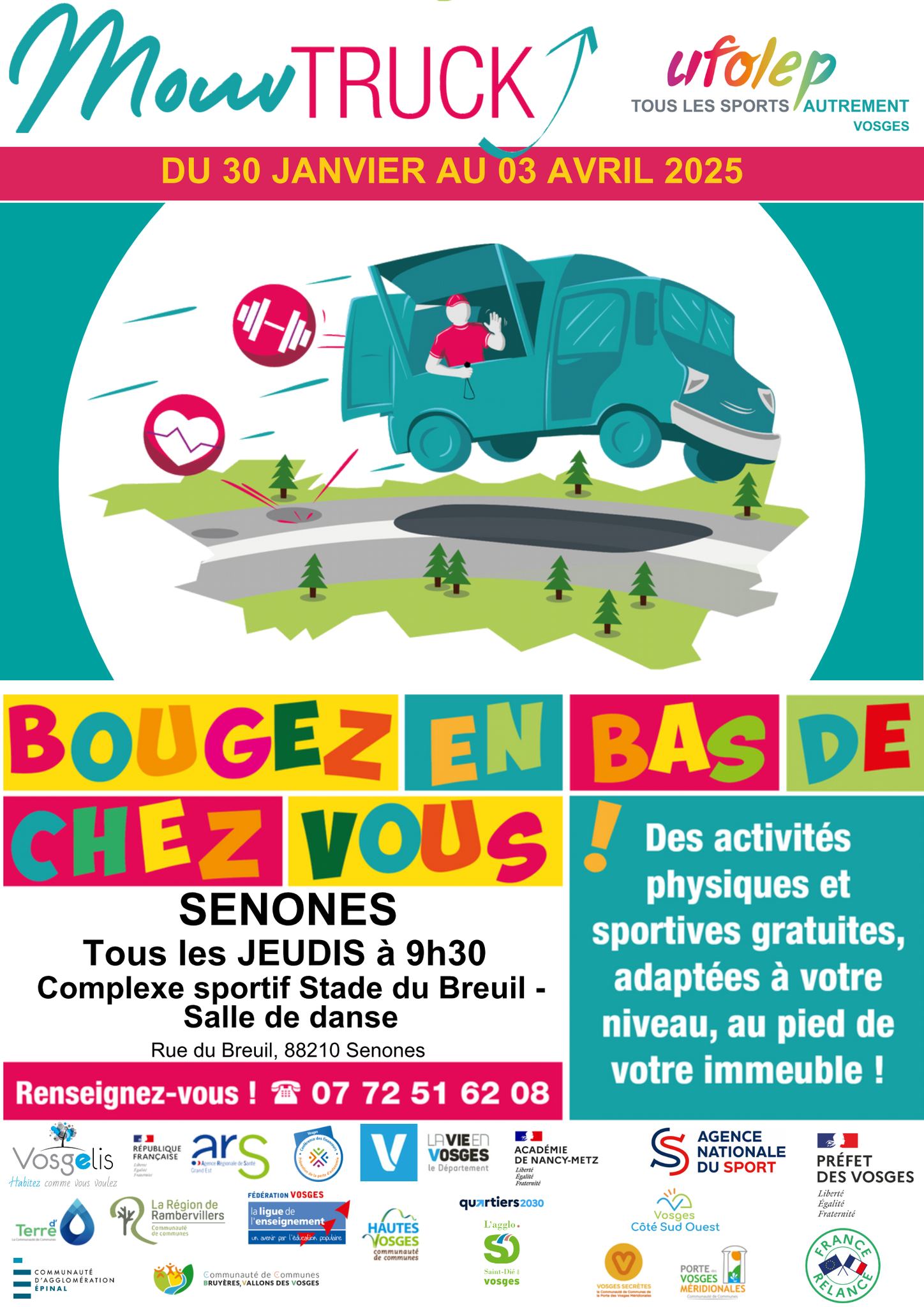Du jeudi 30 janvier au jeudi 3 avril, le Mouv’Truck sera de retour à Senones. Chaque jeudi à partir de 9h30, au complexe sportif, stade du Breuil et salle de danse, des activités physiques et sportives gratuites sont proposées, adaptées à tous les niveaux. Plus de renseignements par téléphone, au 07-72-51-62-08.