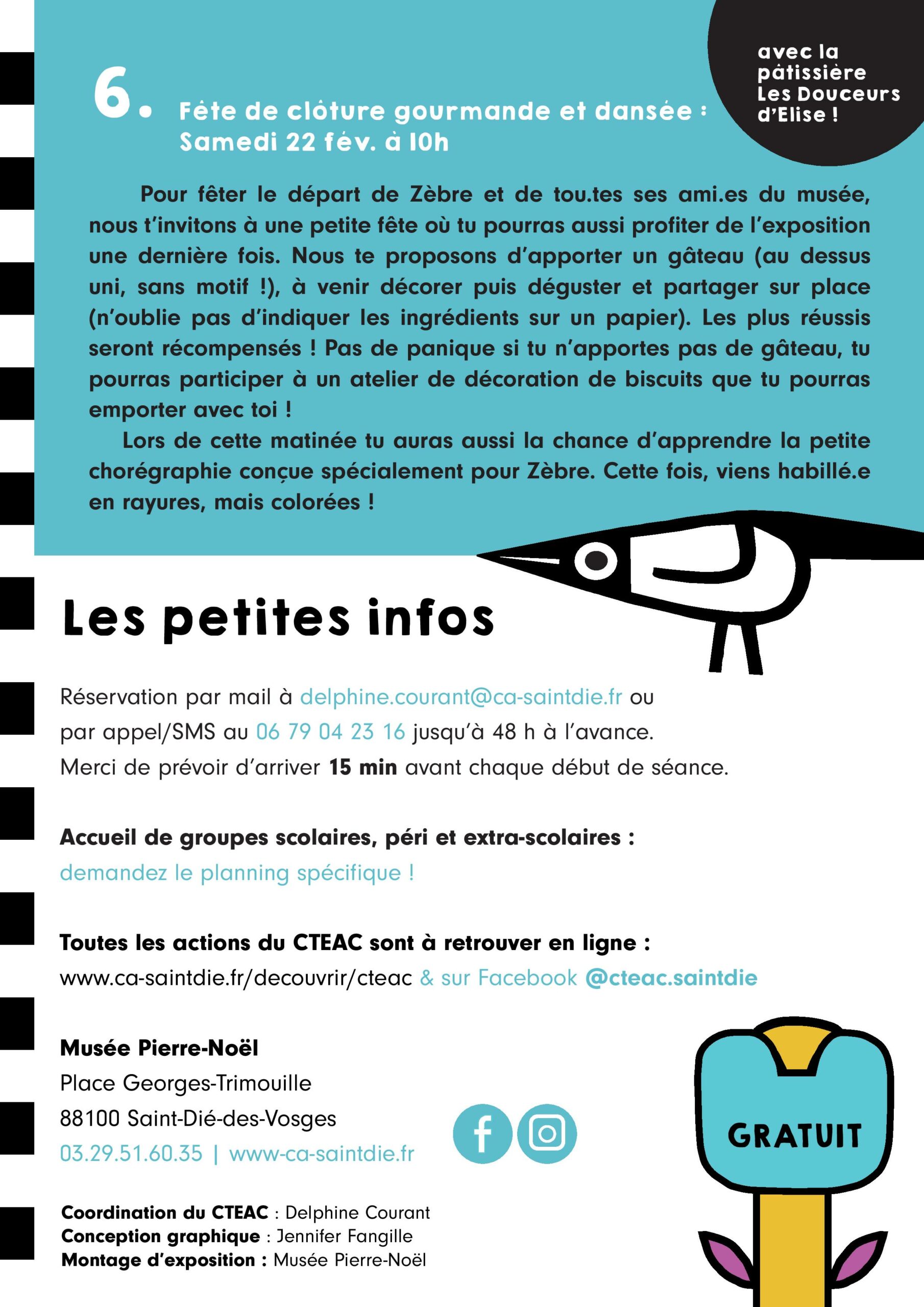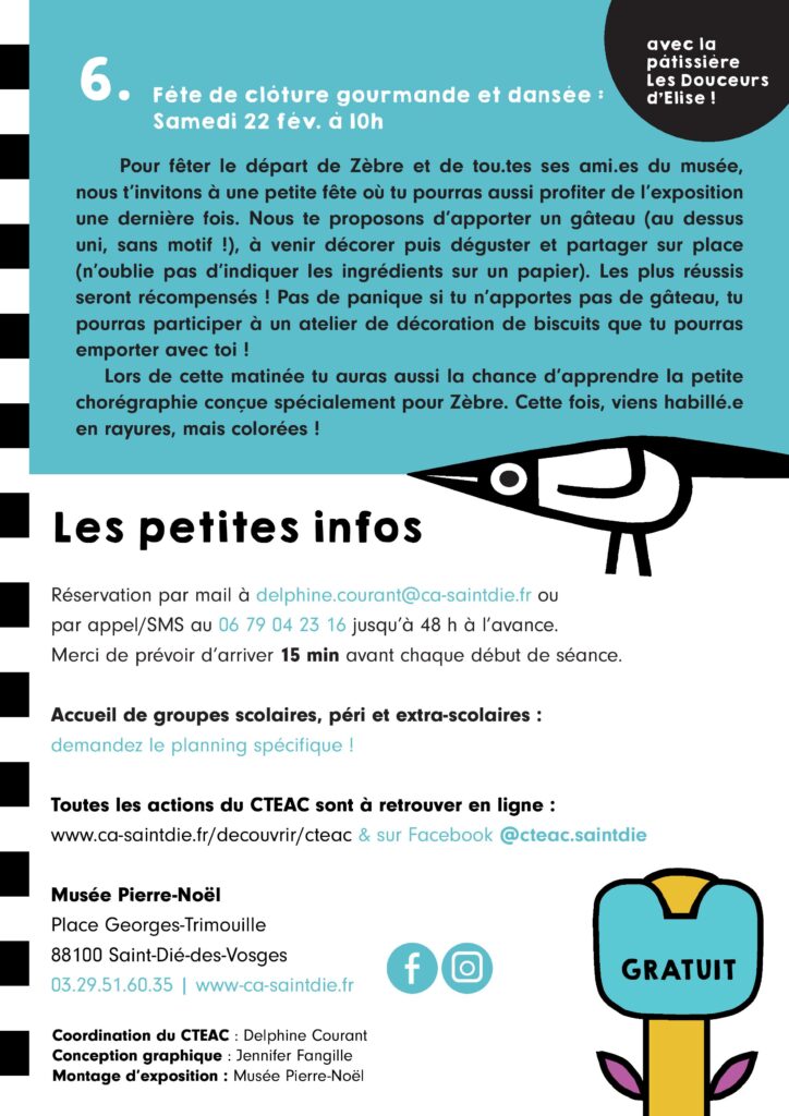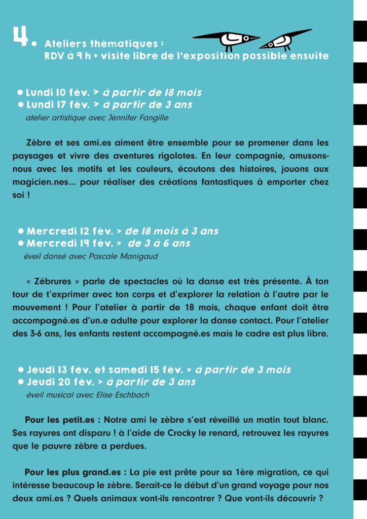 Sont également proposés des ateliers thématiques, un jeu de piste dès 3 ans et une fresque géante collaborative. Sans oublier la grande fête de clôture, gourmande et dansée, qui aura lieu le dernier jour de l’exposition, ainsi que les 5 séances du film « Zibilla ou la vie zébrée », fruit d’un partenariat avec le cinéma l’Excelsior.
