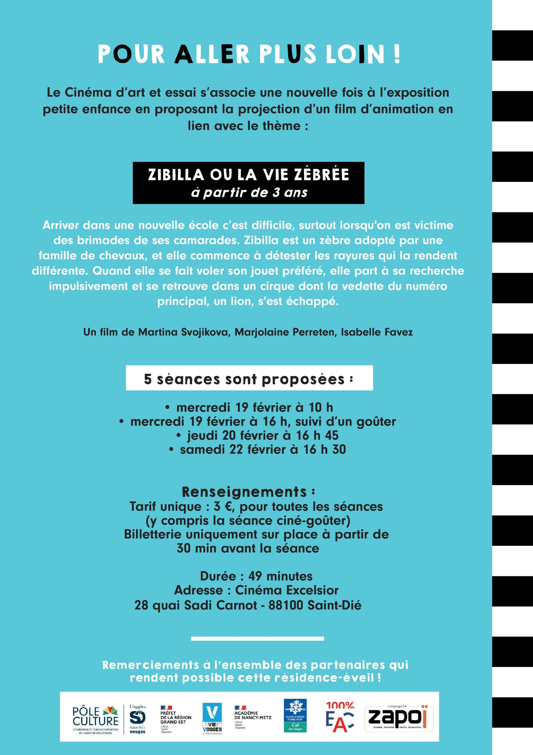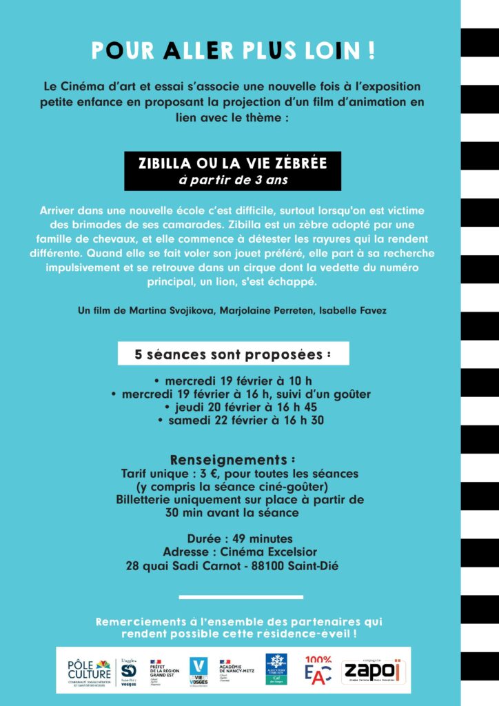 Le programme complet et détaillé de « Zébrures » est à retrouver ci-dessous, en sachant que les éventuelles réservations se font jusqu’à 48h à l’avance, par courriel via delphine.courant@ca-saintdie.fr, ou par appel/SMS au 06-79-04-23-16. A noter enfin qu’il est demandé d’arriver 15 minutes avant chaque début de séance.