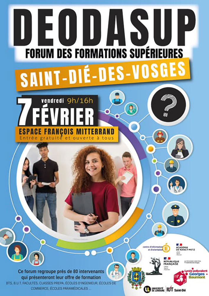 Déodasup est le forum déodatien des formations supérieures. Pour la 21e édition de Déodasup, toujours organisée par les lycées Jules-Ferry et Georges-Baumont, ce sont près de 80 intervenants qui seront réunis ce vendredi à l’Espace François-Mitterrand.
