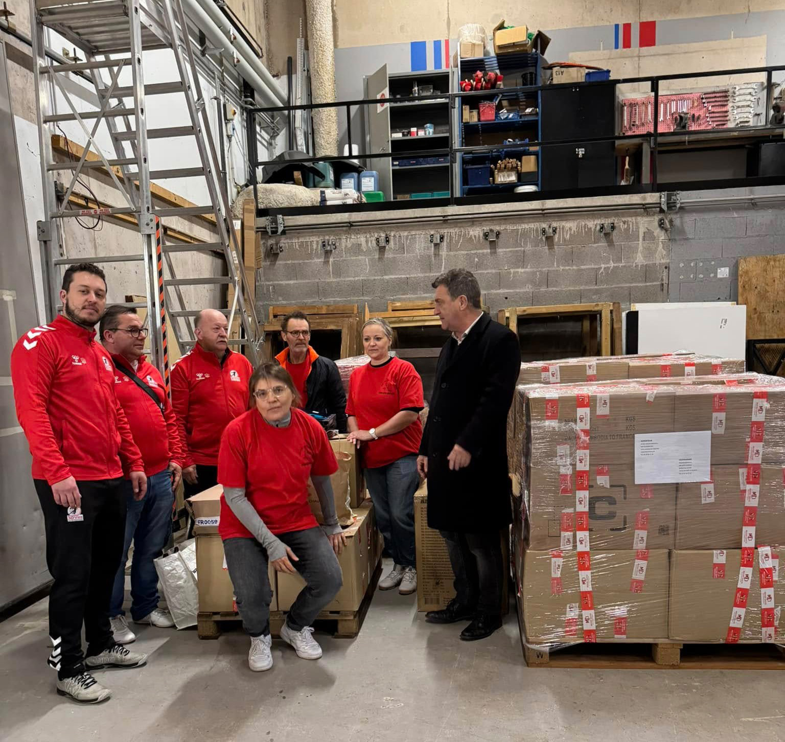 Le maire Bruno Toussaint a rendu visite au SDV Handball avant l’envoi du container vers la Côte d’Ivoire. (Photographie SDV Handball)