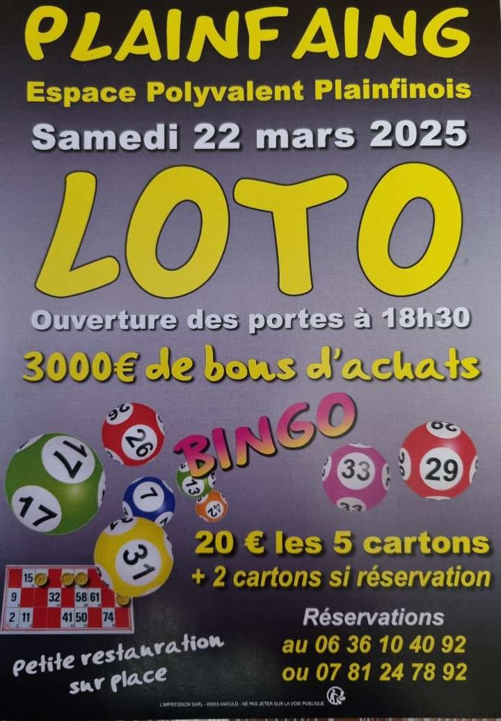 L’amicale des sapeurs-pompiers de Plainfaing organise son loto à l’Espace Polyvalent Plainfinois, le samedi 22 mars prochain. Ouverture des portes à 18h30. 3000€ de bons d’achats à gagner. Informations complémentaires ci-dessous :