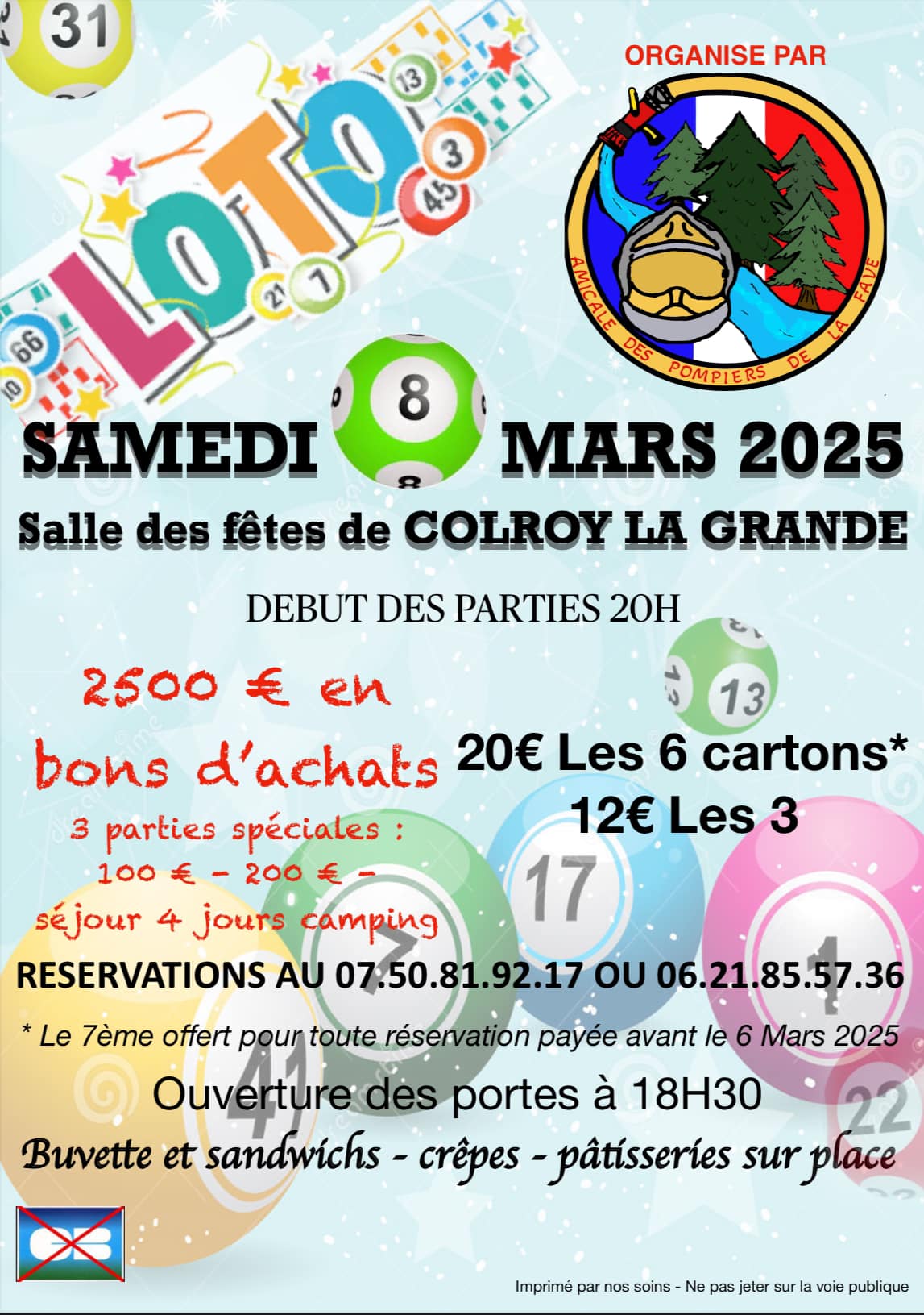 L’Amicale des Pompiers de la Fave organise son loto à la salle des fêtes de Colroy-la-Grande. Ouverture des portes à 18h30, pour un début des parties à 20h.
