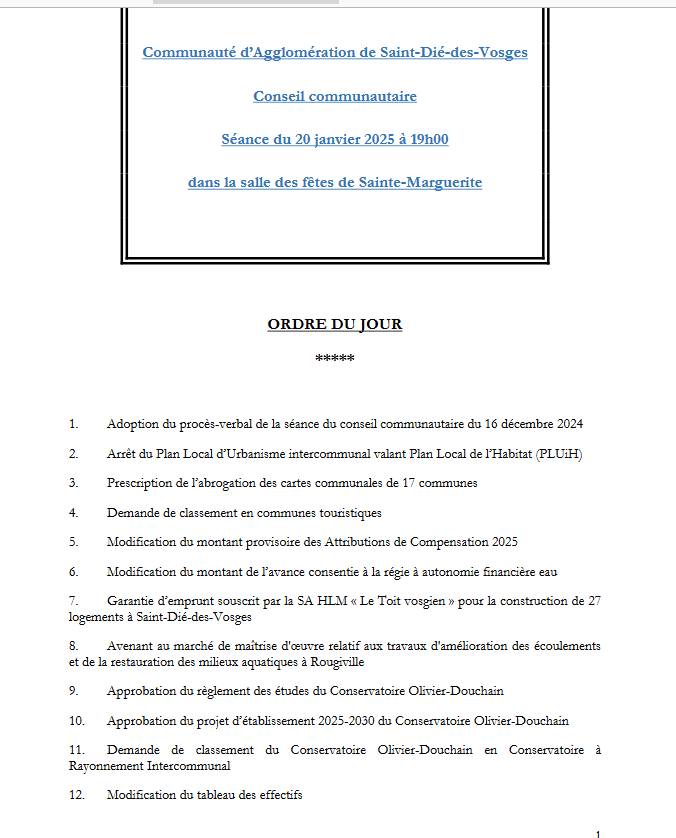 Concrètement, l’année 2025 de l’intercommunalité sera marquée, dans ses grandes lignes, par la présentation du Schéma d’Accueil et de Diffusion de l’Information – SADI de l’Office de Tourisme intercommunal, « qui définira sa stratégie d’accueil touristique sur l’Agglomération toute entière » ; la concrétisation du projet « P3S » sur le site des anciennes papeteries du Souche, « avec le démarrage des travaux du centre national de formation aux métiers de la Sécurité Sûreté et Secours » ; la concrétisation également du Plan Local d’Urbanisme Intercommunal – PLUiH, « document fondateur, colonne vertébrale de notre aménagement du territoire » ; l’adoption du Plan de Mobilité Simplifié, « permettant d’identifier les projets à mener en priorité pour le développement des mobilités actives et collectives sur le territoire » ; le développement d’une véritable politique cyclable, avec un travail sur la continuité cyclable des 3 voies vertes entre Saint-Léonard et Raon-l’Etape.